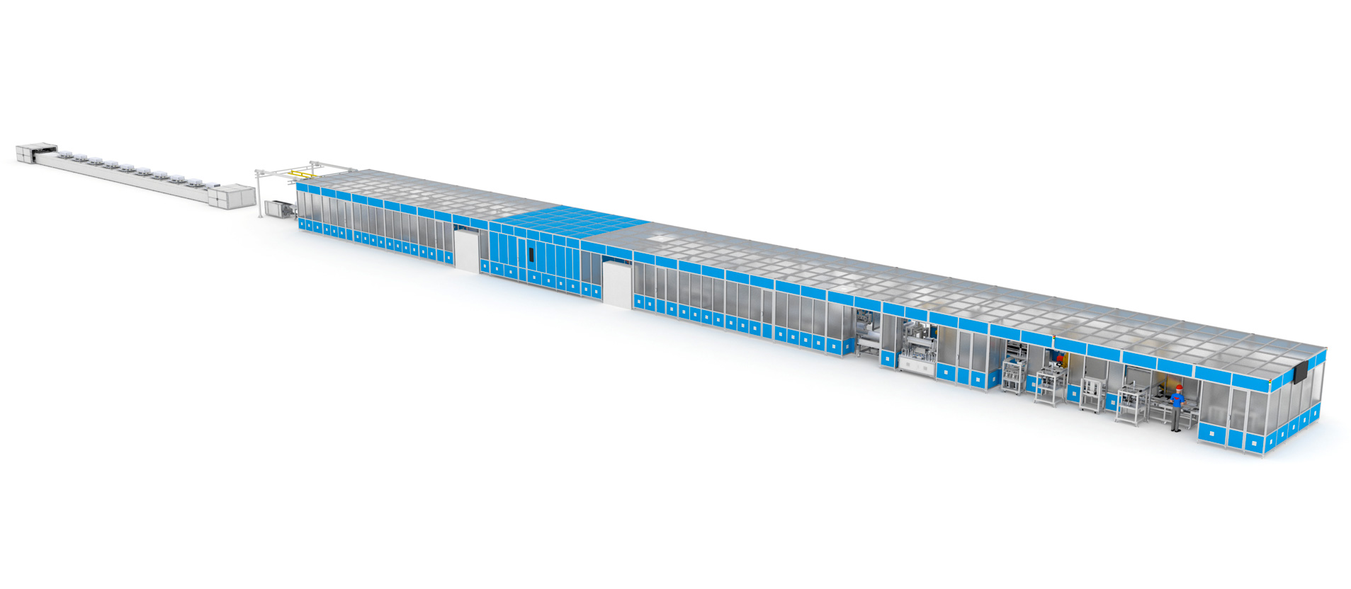 该产线是将方形电芯组装成模组,再将模组组装成储能电池包的自动化生产线,其工艺流程包括:电芯上料、OCV/IR、电芯处理、模组堆叠、汇流排焊接、焊接检查、模组测试(EOL),PACK组装等。